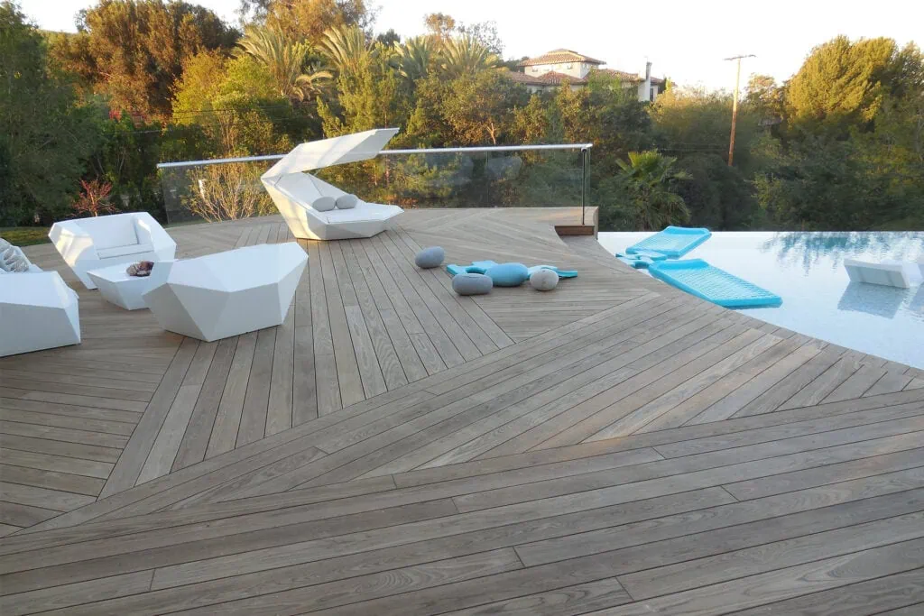 Yüzme havuzu çevresinde ahşap zemin kaplaması kullanılabilir. Yukarıdaki resimdeki termo-kül tasarımı gibi termal olarak değiştirilmiş ahşap döşemenin büyük bir avantajı, ayaklarınızın altındaki zeminin çok ısınmamasıdır, bu da havuza girip çıkarken ısıdan korunacağınız anlamına gelir.